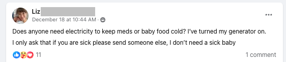 Thankfully for our pipes, the temperatures were relatively mild for a December in Maine for the first few days - in the 40s. But that didn’t help those without power stay warm or food stay frozen. That is where local communities (and the Facebook groups that connect them!) stepped up.